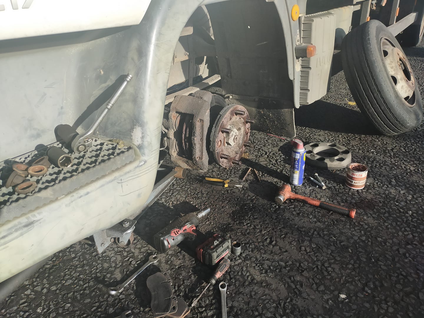 Another busy day, brake caliper seized, side of the road, free up new pads and keeper moving forward,